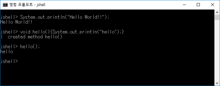 JDK9부터 적용되었고 JShell 을 사용하려면 cmd 창에서 jshell을 입력하기만 하면 된다.