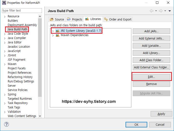 2) 경고 표시가 있으면 Remove - Add Library - JRE System Library 선택