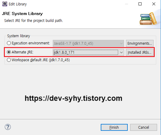 3) JRE 버전 변경 or Workspace default JRE 버전 선택