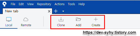 1.SourceTree 실행 후 상단에 Clone, Add, Create 중에 각자 상황에 맞게 선택.