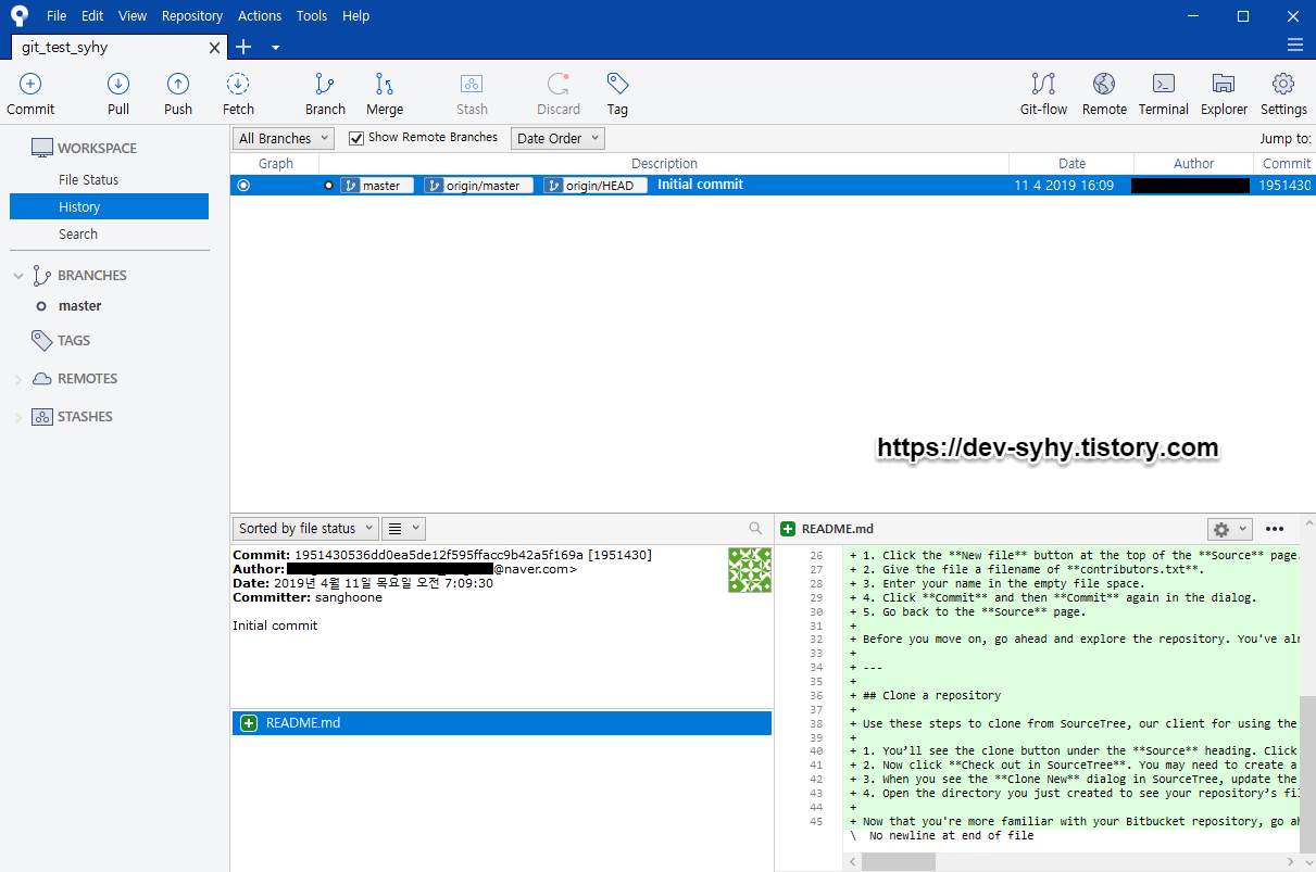 6)처음 Bitbutket에서 Repository를 만들고 기본으로 생성되었던 README.md 파일을 볼 수 있다.