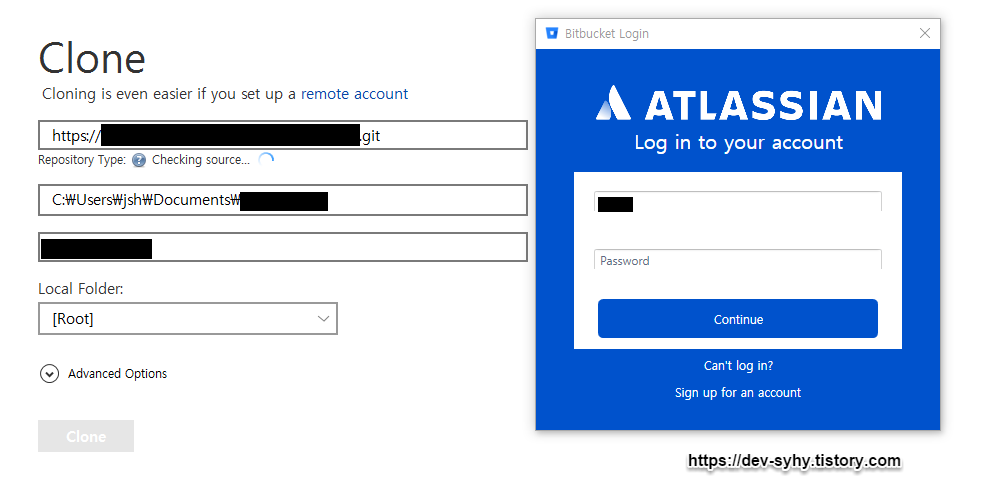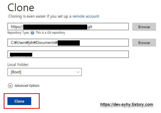 두번째 칸은 자신의 컴퓨터에 어디에 위치할 것인지 지정하고 Clone 버튼 클릭