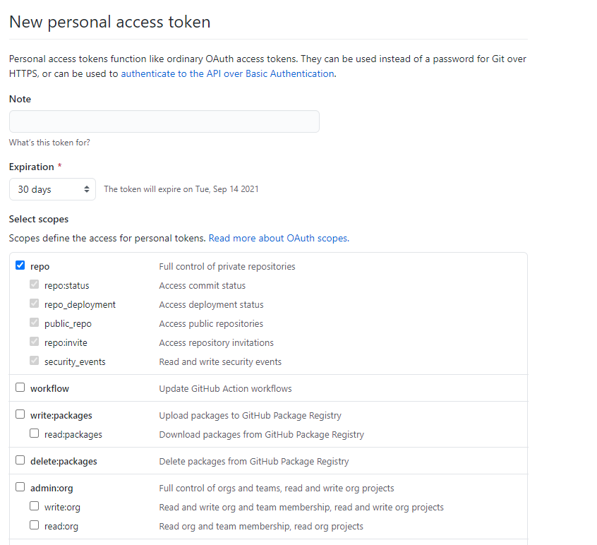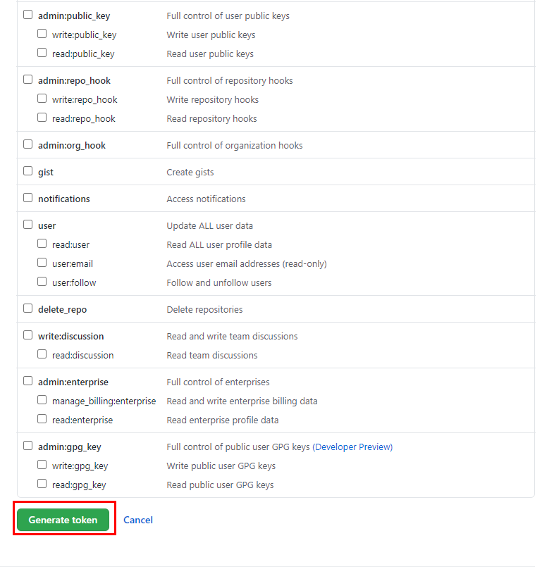 - 기간 및 scopes부분에 원하는 영역 선택 후 하단 Generate token 버튼 클릭